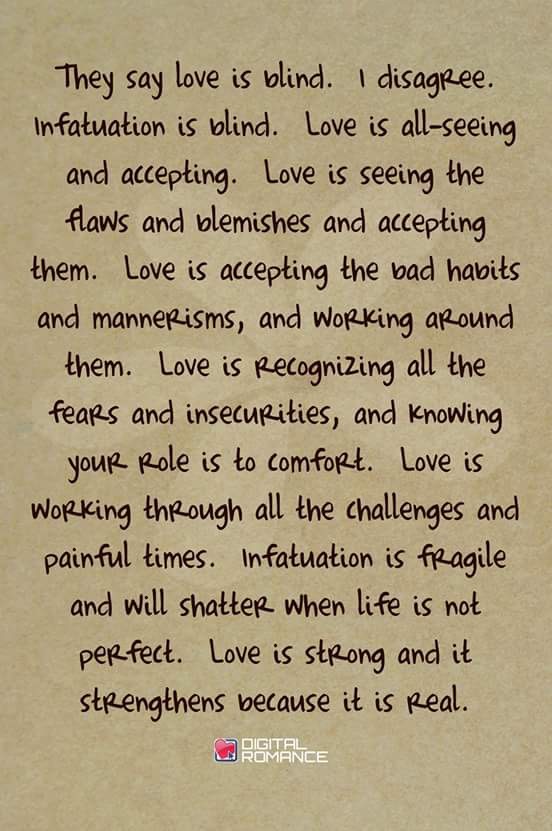 . You can't truly love somebody without really knowing their core essence: . It’s not uncommon to find yourself wondering if you’ve found true love.Over time, a simple crush can infatuation vs love. Whereas infatuation tends to happen very quickly and involves a strong attraction, love is a much deeper experience of knowing someone fully, .
